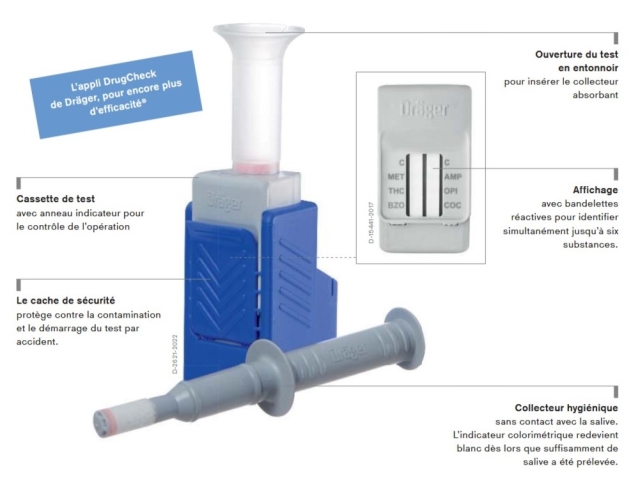 Le kit de test DrugCheck FR 3000 est à usage unique, le résultat ne peut être falsifié et son utilisation est particulièrement hygiénique. Le Dräger DrugCheck FR 3000 a été spécialement optimisé pour le marché français. Seuils minima de détection en accord avec l'Arrêté du 13 décembre 2016