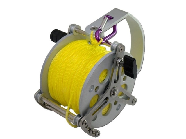 Dévidoire Alu/Inox avec poignée, guide fil et mousqueton – 120m de fil ∅ 1.5mm